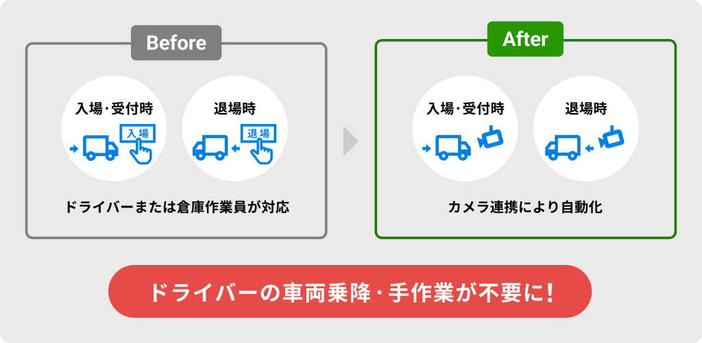 - 車両の物流拠点への入退場登録が自動化されます。これにより、事務所スタッフの作業負荷が軽減されるとともに、入退場の実態を反映した時間データを安定的に記録・蓄積できます。