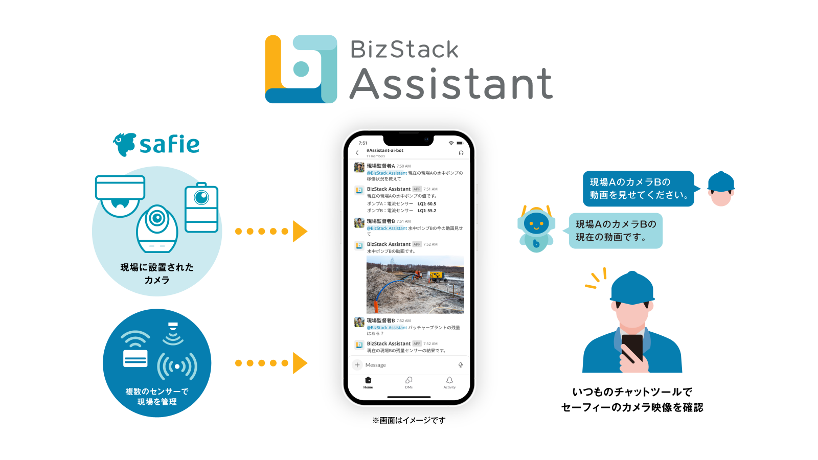 例えば、普段お使いのチャットアプリ上で「現場AのカメラBの映像を見せて」と入力するだけで、Safieの映像がチャット画面上に直接表示され、その場で現場の状況を確認できるんです。
